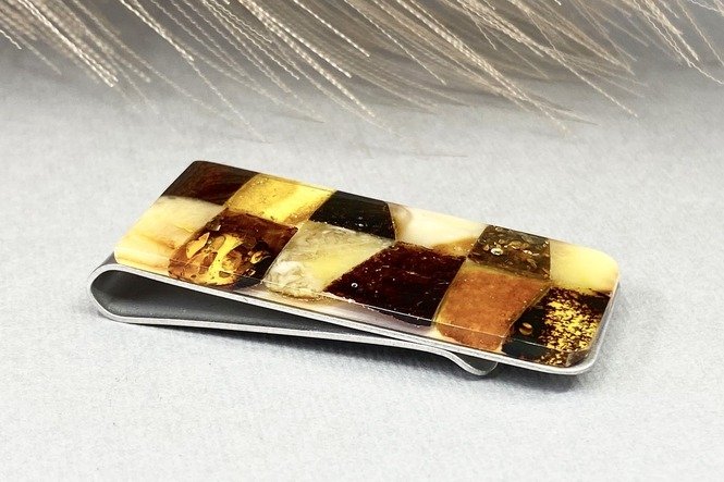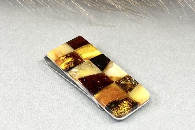 Pinigų laikiklis, dekoruotas natūralaus gintaro mozaika.