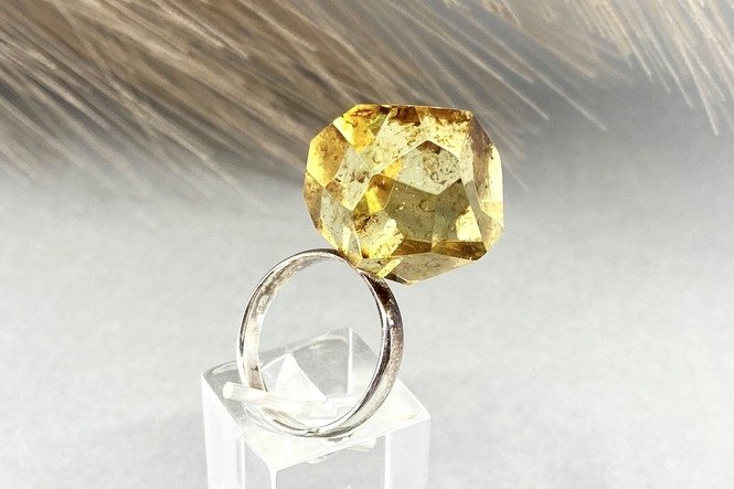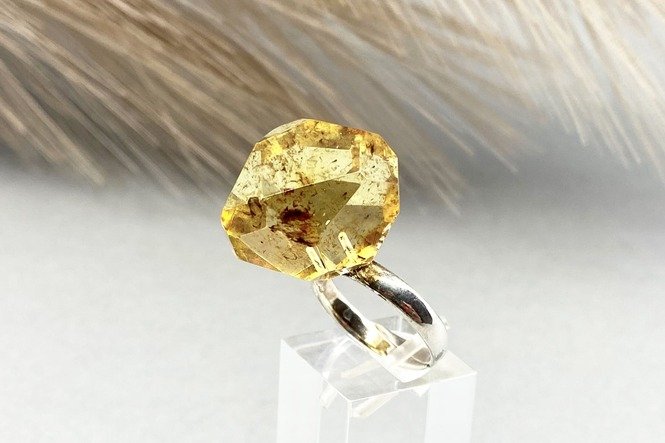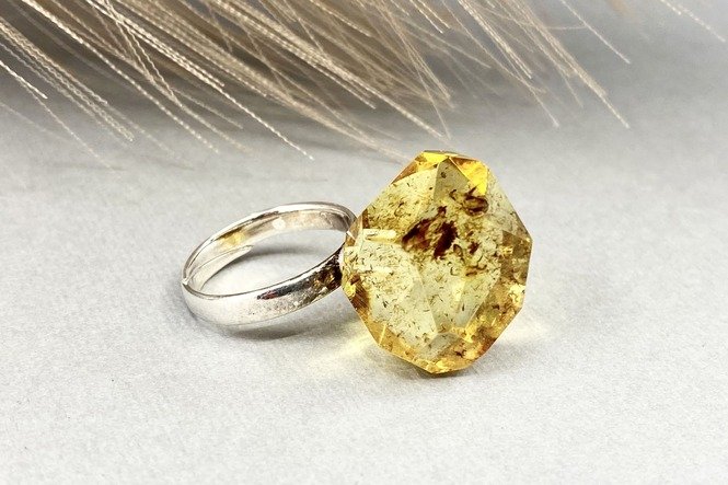 Gintaro diametras  19 mm. Žiedo dydis reguliuojasi, tad tiks ir didesnį dydį nešiojančiai.